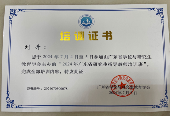 9428cn太阳集团古天乐教师刘升副教授于2024年7月4—5日参加广东省学位与研究生教育学会举办的“2024年广东省研究生指导教师培训班(第二期)”。