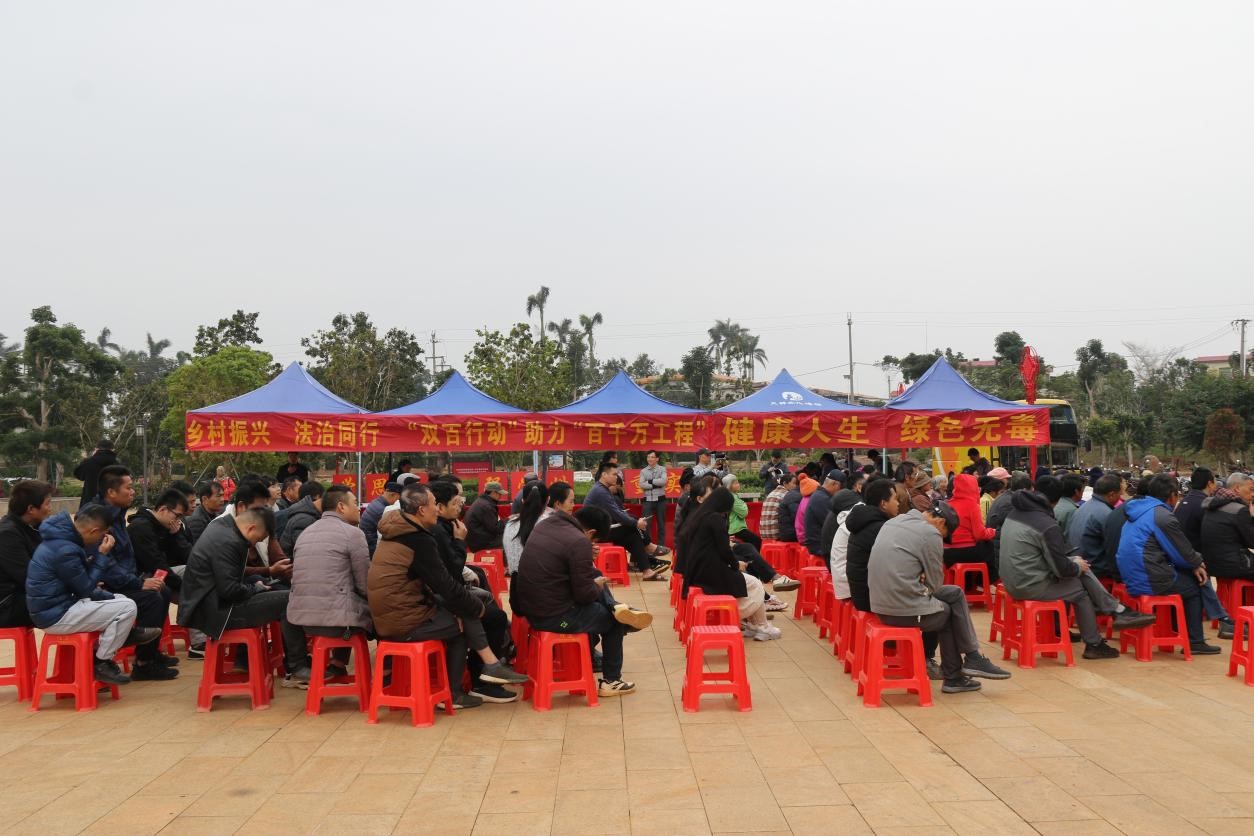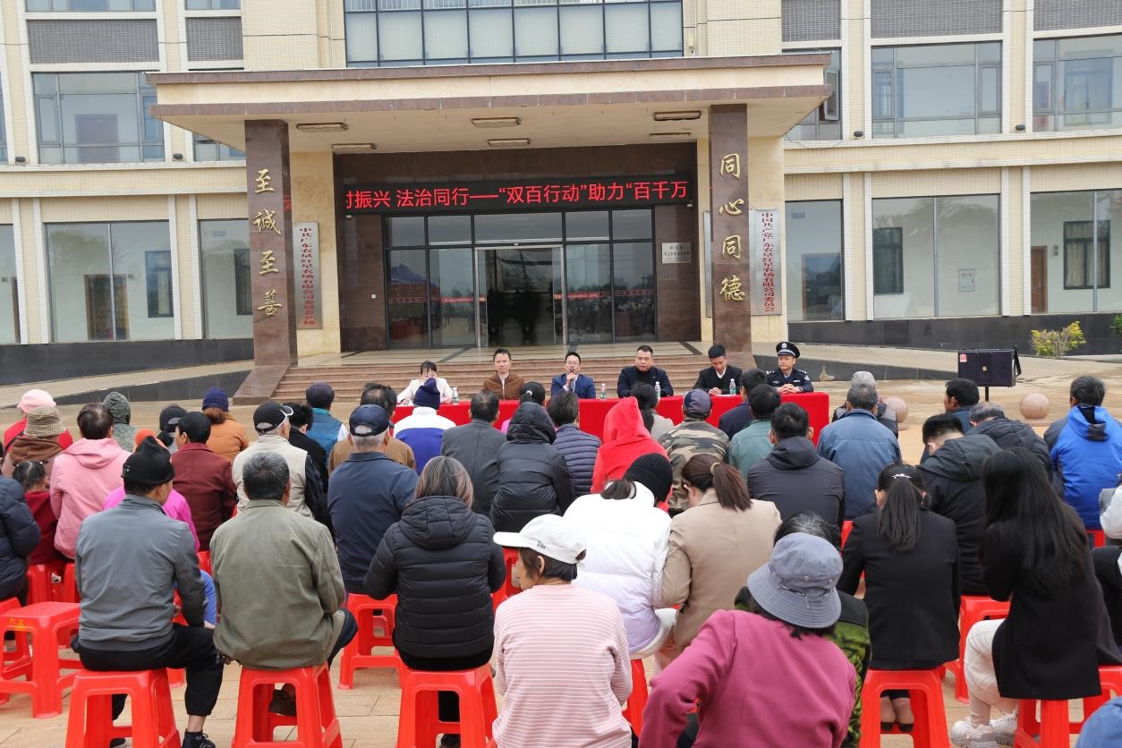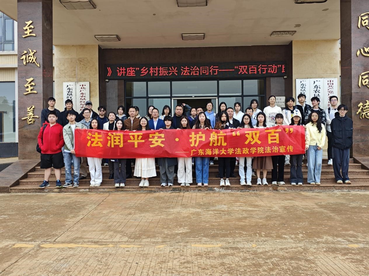 为进一步贯彻落实习近平总书记关于加强法治人才培养的重要指示,践行广东省委“百千万工程”决定、广东省教育厅“双百行动”工程,履行公司与湛江市徐闻县司法局签订的“双百行动”合作协议,强化《法治宣传》课程实践教学质量,提升公司法学本科生的法治宣传实务能力,探索并创新人才培养模式,12月27日上午,9428cn太阳集团古天乐与徐闻县委政法委、徐闻县司法局、徐闻县禁毒办在广东农垦红星农场有限责任公司共同开展法治宣传、“双百行动”活动。公司副经理刘澍教授、实践教学中心主任周立波同志、刑事法学系主任张科副教授、吴运时博士、办公室主任宁乐添同志和法学2022级8班的所有同学,与湛江市徐闻县司法局莫光智副局长、徐闻县政法委副书记莫小维、红星农场副总经理周建华及相关10余名同志一起参加了此次活动。