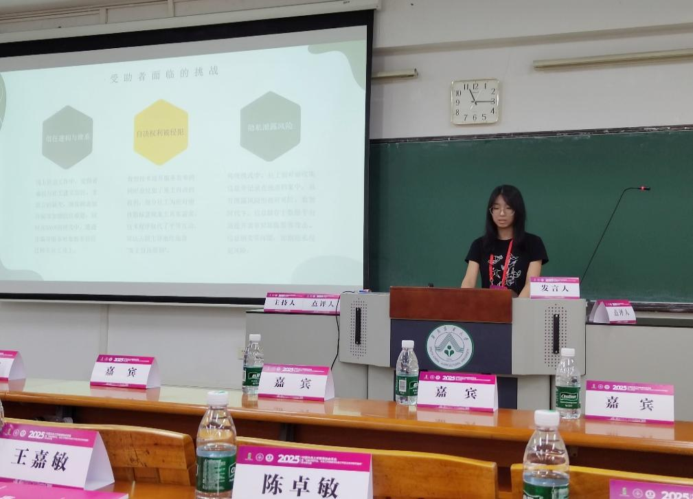 在“数智社会工作”分论坛上,社会学专业李慧晖同学在郭浩老师指导下撰写的论文《数智时代社会工作实践面临的挑战与应对——基于知识社会学视角》,凭借新颖的研究视角、扎实的调研方法及严谨的逻辑分析获邀参会。发言中,她从知识社会学理论出发,深入解析数智时代下社会工作者、受助者与政策法规三大主体面临的挑战,并提出切实可行的应对策略,助力社会工作实践发展。