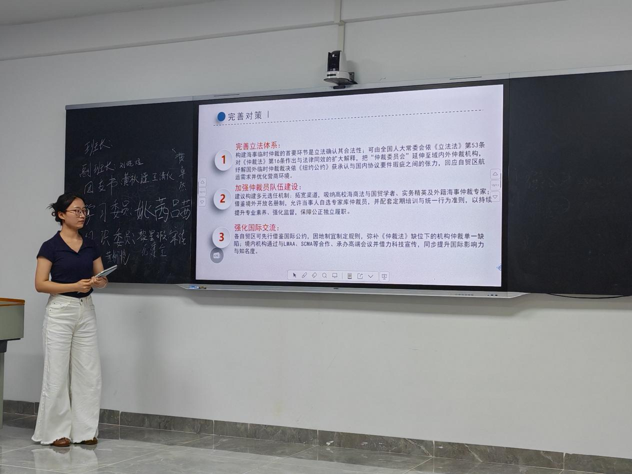 活动现场,24级研究生林蓓菁、谭卓篇、陈毅沅、郑清媛、陈小妹等五名同学依次登台发言,围绕为省法学会海洋法学研究会、航运法学研究会2025年会员大会与学术年会所撰写的学术论文展开分享。活动采取一报告一交流的方式渐次展开。作者详细介绍了论文的研究背景、问题的提出,分析过程、解决对策与论证逻辑,引发了现场热烈讨论。刘澍副经理对论文进行点评,尤其是对其中的关键问题,结合同学们的交流内容进行了简要地解释,阐释了问题的由来,讲解相关法律制度的内涵及实践情况,有效拓展了同学们的学术视野与专业认知。