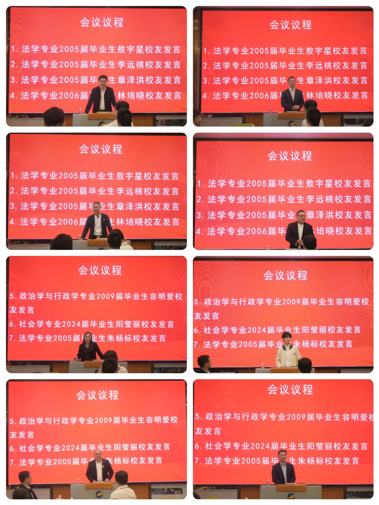 员工代表发言是整场会议的情感与思想高地。八位来自不同年级、不同专业的员工从“在校成长、职场历练、感恩母校”三个维度,讲述了专属于法政人的青春与担当。敖宇星员工回首在校奋斗岁月,以“不惧风雨方得成长”的感悟,呼吁员工们敢于分享失败经历,助力在校生成长。李远桃员工分享从检察官到律师的职业转型故事,以“顺势而为+终身学习”的心得,鼓励在校生通过深造开拓视野。章泽洪员工追忆校园趣事,感念老师对员工的言传身教,直言“校园岁月塑造的价值观,是终身受益的精神底色”。朱杨标员工深情讲述在校求学经历,回忆师生同窗深厚情谊,令在场所有人无不动容。员工林培晓、容明爱、阳莹丽、林金亮也纷纷发言,言语中无不饱含着对恩师栽培的感激、对同窗情谊的珍视以及对母校日新月异发展的自豪。