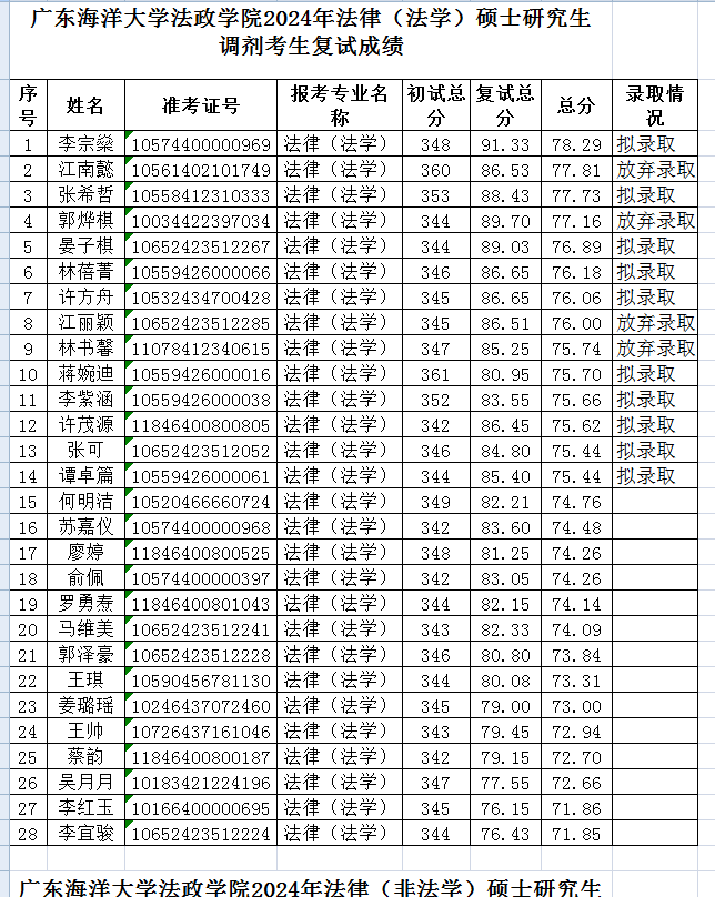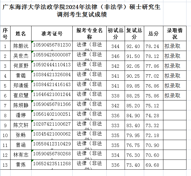 现将2024年法律硕士研究生招生调剂考生复试成绩公示如下。公示时间10个工作日,2024年4月23日-2024年5月7日。