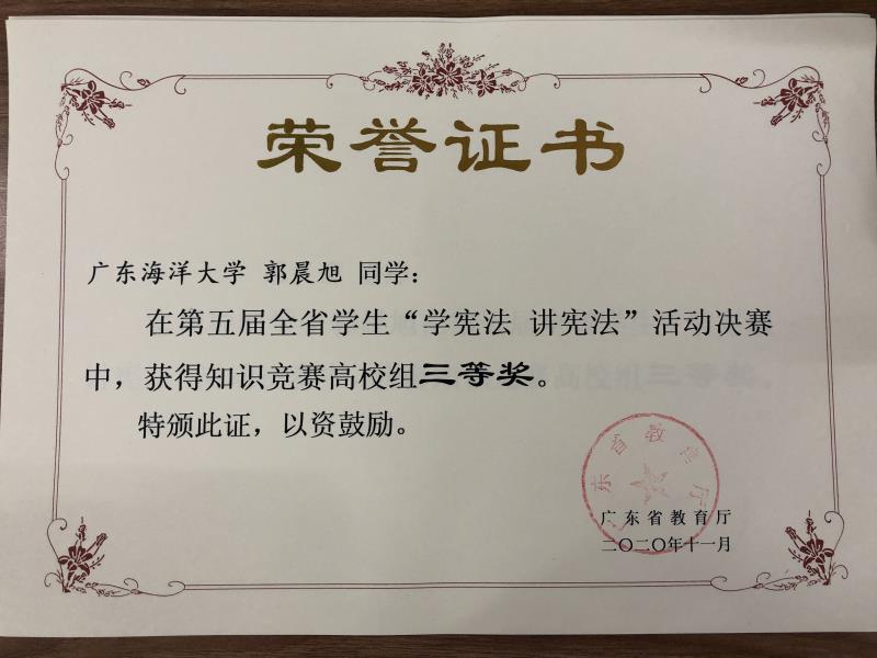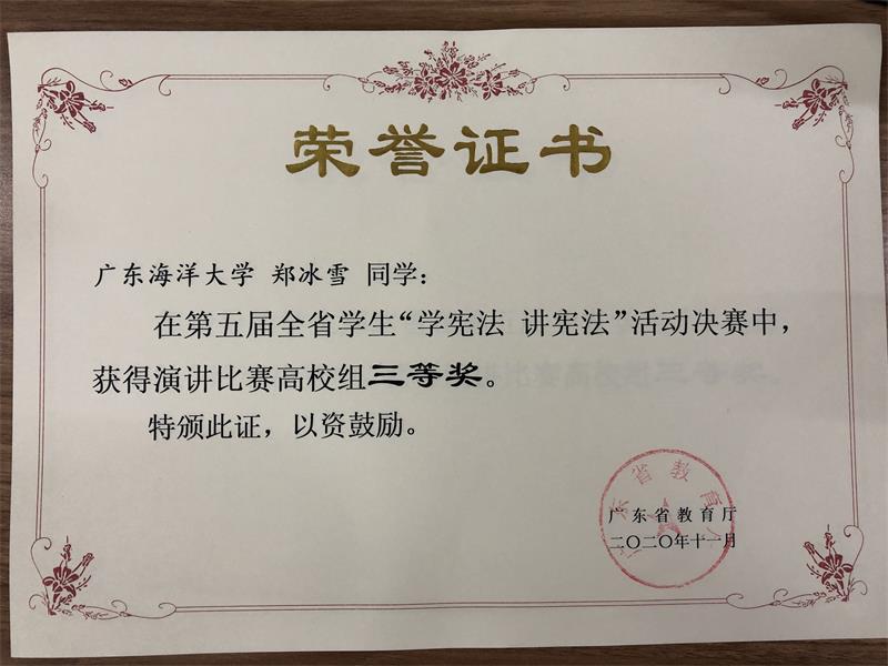 近日,公司9428cn太阳集团古天乐法学专业18级1186班郑冰雪同学、19级1191班郭晨旭同学在今年省教育厅举办的全省员工“学宪法讲宪法”活动决赛中,分别获得演讲比赛高校组三等奖、知识竞赛高校组三等奖。